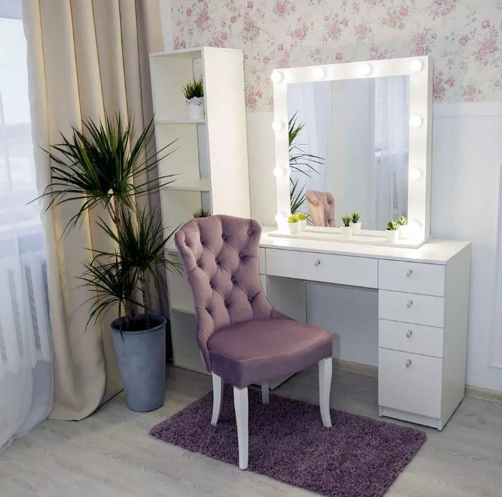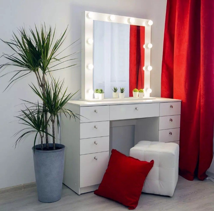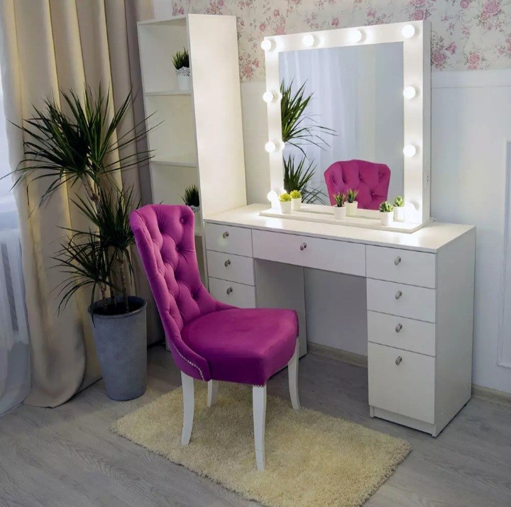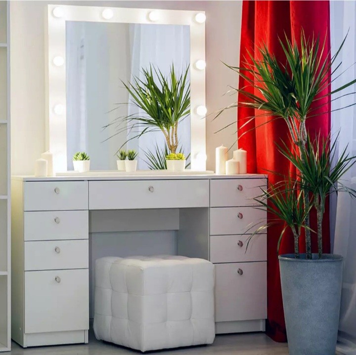 Візажний туалетний столик для макіяжу виглядає стильно та красиво. Велика робоча поверхня, центральний ящик і 2 тумби, в кожній з яких по 4 шухлядки. На ящиках використано телескопічні напрямні. Дзеркало менше шириною і може бути окремо від столика. Габарити виробу: ширина - 1200 мм; висота - 1600 мм; глибина - 400 мм; ящики - 9 шт; патрони - 10 шт. лампочки -10шт Габарити столу: ширина - 1200 мм; ширина тумби - 300 мм; висота - 800 мм; глибина - 400 мм; Габарити дзеркала: ширина - 900 мм; висота - 800 мм; глибина - 80 мм Особливість: вимикач (з правого боку).