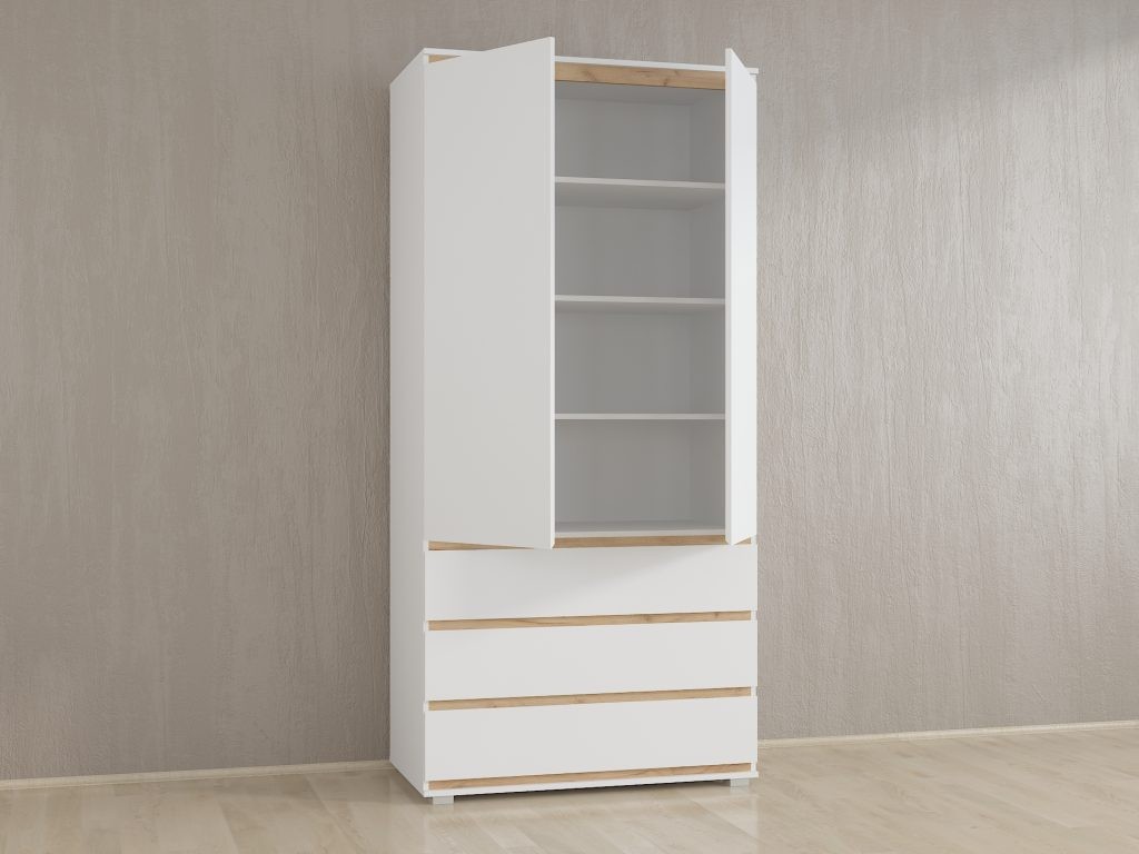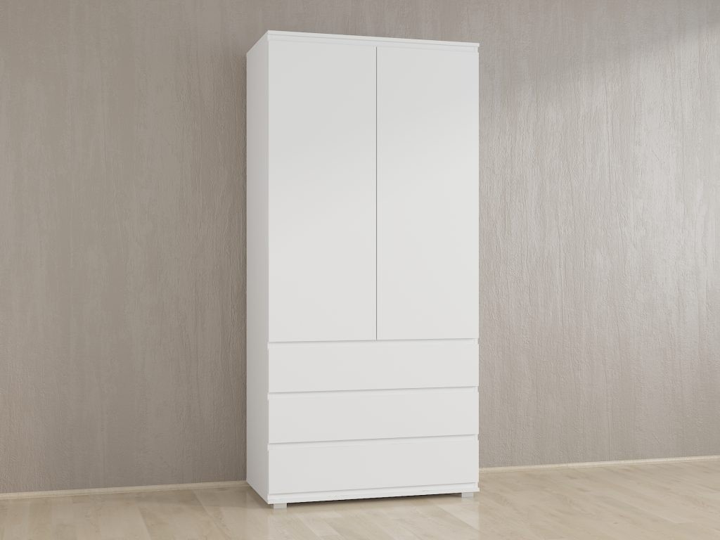 Двохдверна шафа для одягу (Б-1), від українського виробника, має дуже практичне та продумане планування. За розпашними дверима, розміщено чотири широких полиці. В нижній частині - три висувних шухляди. Завдяки своєму універсальному дизайну, та великій палітрі кольорів, шафу можна використовувати в будь-якій частині будинку, а також в офісних та комерційних приміщенях.